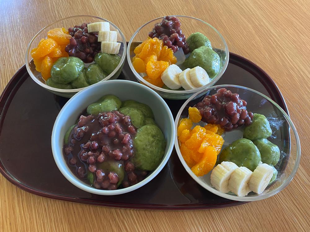 家に買ってあった白玉粉に加えて、よもぎ入りのお団子に。